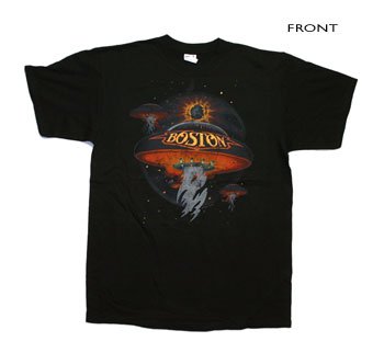 Boston t-shirt with a full color spin off of the band's artwork from their debut album showing the classic mothership with band's logo on it traveling through space. Printed on a black 100% cotton t-shirt.